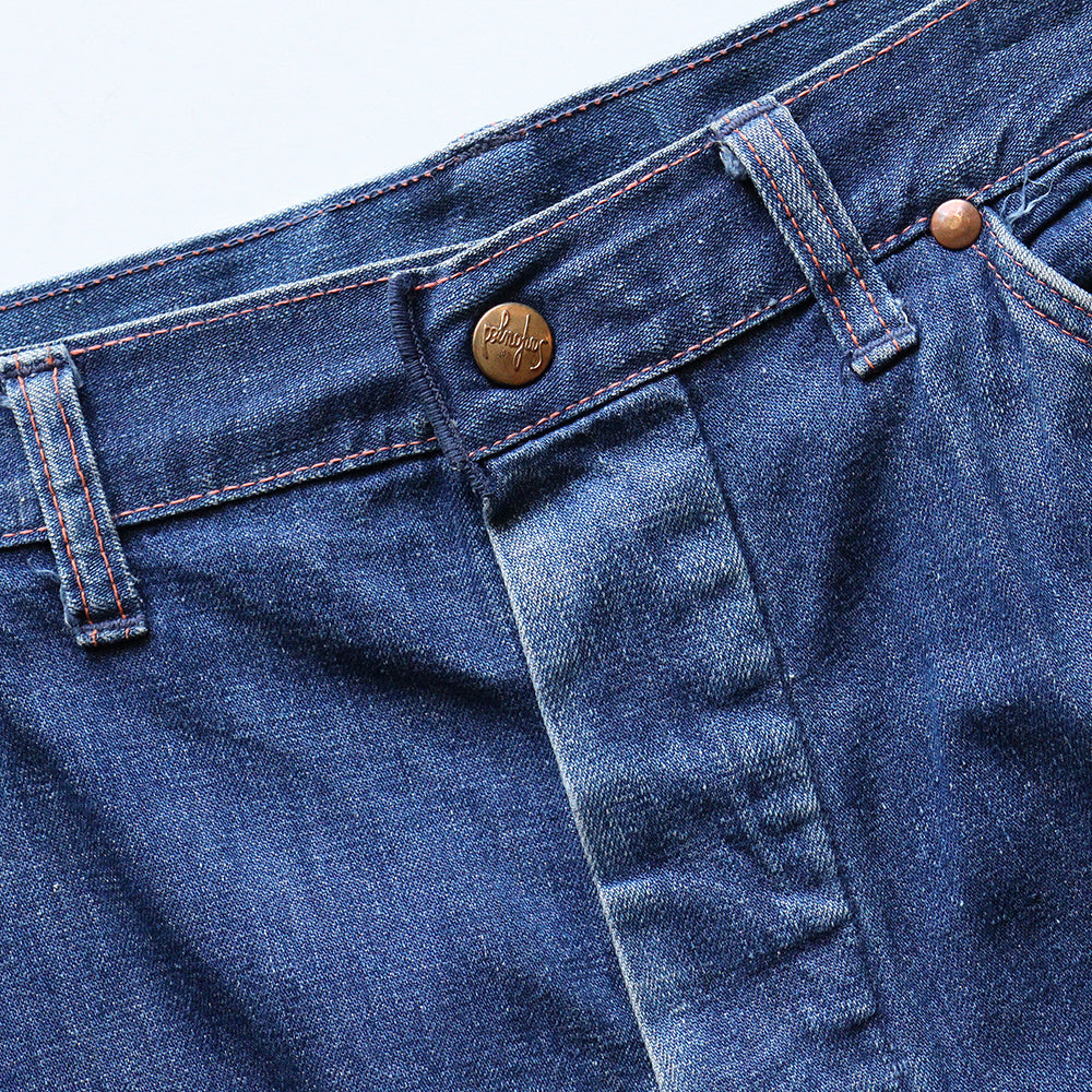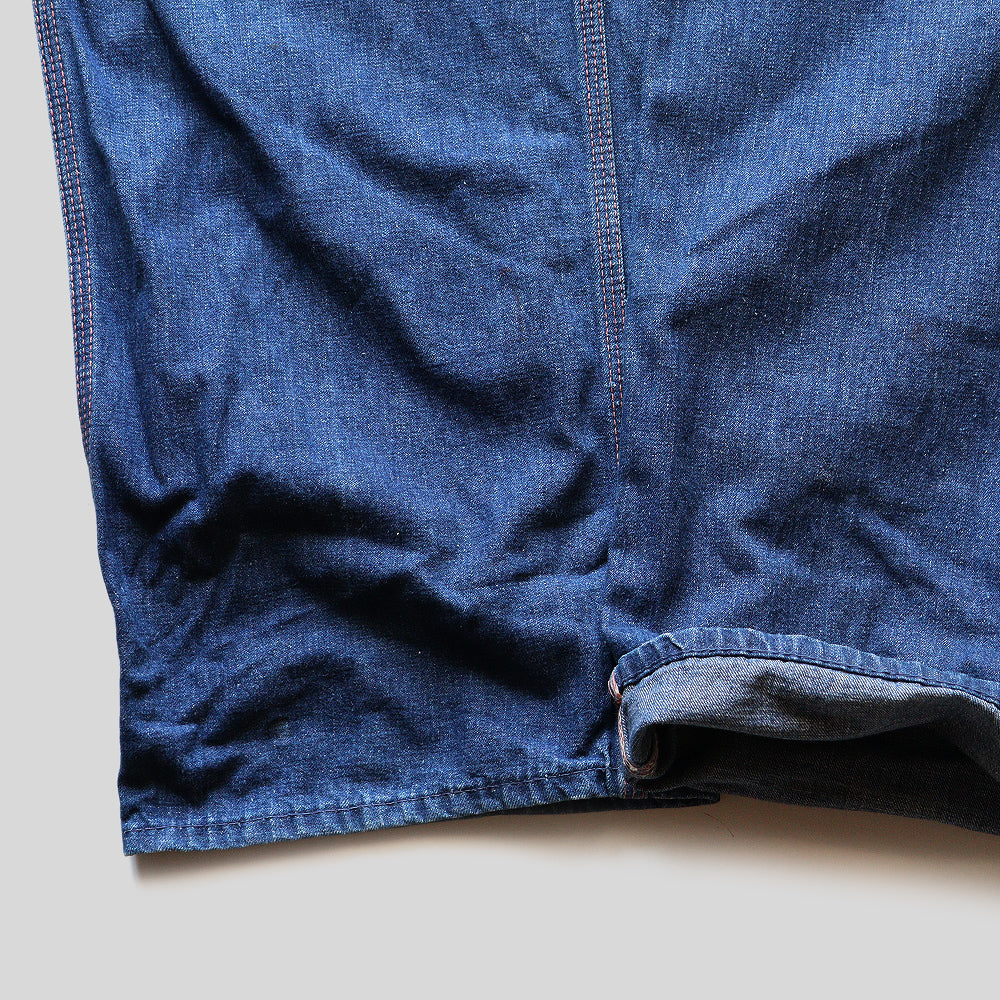 古いディテールが随所にみられ、フロントボタンフライにポケット裏リベット、当時ならではの美しいライトンスインディゴデニムにオレンジステッチが映える雰囲気抜群のペインターパンツとなります。