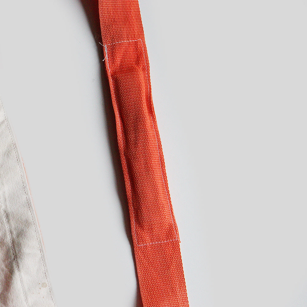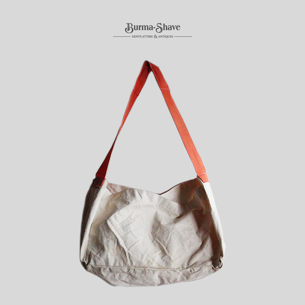 古い個体ではありませんがプレーンのキャンバスボディーにオレンジのストラップが映えるシンプルで使い勝手の良いニュースペーパーバッグとなります。